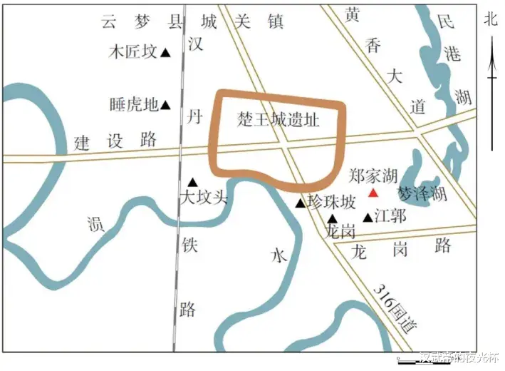 据史料记载,楚王城遗址位于云梦县城关,总占地面积约2.1平方公里,周长约7700米,现存的夯土城墙,距地表高2.7米左右,城墙内外还有宽阔的护城河,河宽可达43.6米。古城总体呈东西长、南北宽的不规则长方形,中间一道南北向的城垣,将城池一分为二。古城门按东西南北四个方向开设,东城门面朝曲阳湖,另外三门,各有一道斜坡正对城门,分别是珍珠坡、季堵坡(也就是后来发现秦简的睡虎地)和黄土坡。