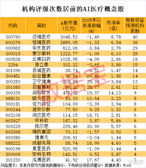 从机构关注度来看,AI医疗概念股中,机构评级次数最多的是迈瑞医疗,合计有40家机构给予其“积极型”(含增持、买入、强烈推荐等)评级。其次是恒瑞医药、华东医药、爱尔眼科、云南白药、信立泰等。