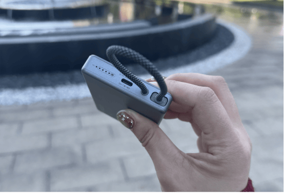它自带 Type-C 和 Lightning 两根线,收纳后还能当挂绳使用,减少了单独带线的麻烦,这一点在高频使用场景下很实用。多接口同时输出时,功率分配相对均匀,不容易出现某一路明显掉速。