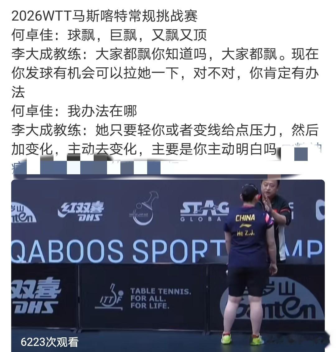 刚刚何卓佳和杜凯琹的比赛,局间的时候佳佳和李大成教练说:“球飘,巨飘,又飘又顶。”然后大成教练说:“大家都飘你知道吗,大家都飘。现在你发球有机会可以拉她一下,对不对,你肯定有办法。”然后佳佳说“我办法在哪?”听了他们这段对话,大家就想到以前马琳场外时说的:“自己想想办法。”这时候队员要是自己能想办法,场外就不需要教练了。