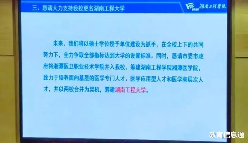 去年9月,网传湖南工程学院恳请市委市政府将湘潭医卫职业技术学院并入我校,筹建湖南工程学院湘潭医学院,致力于培育面向基层的医学专门人才、医学应用型人才和医学高层次人才,并以两校合并为契机,筹建湖南工程大学。