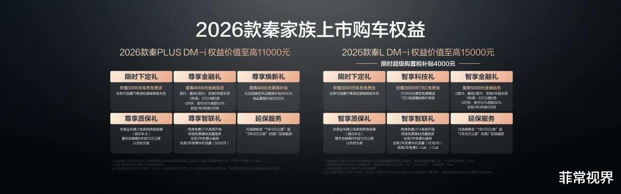 值得一提的是,2026款秦L DM-i 210KM长续航版为追求品质的家庭带来进阶之选,推出价值至高15000元的多重权益。在1月31日前下单,可以享受限时超级购置税补贴4000元;购买210KM云辇型,还可以免费获赠TBC高速爆胎稳行系统,让用户购车更省钱,出行更安全。
