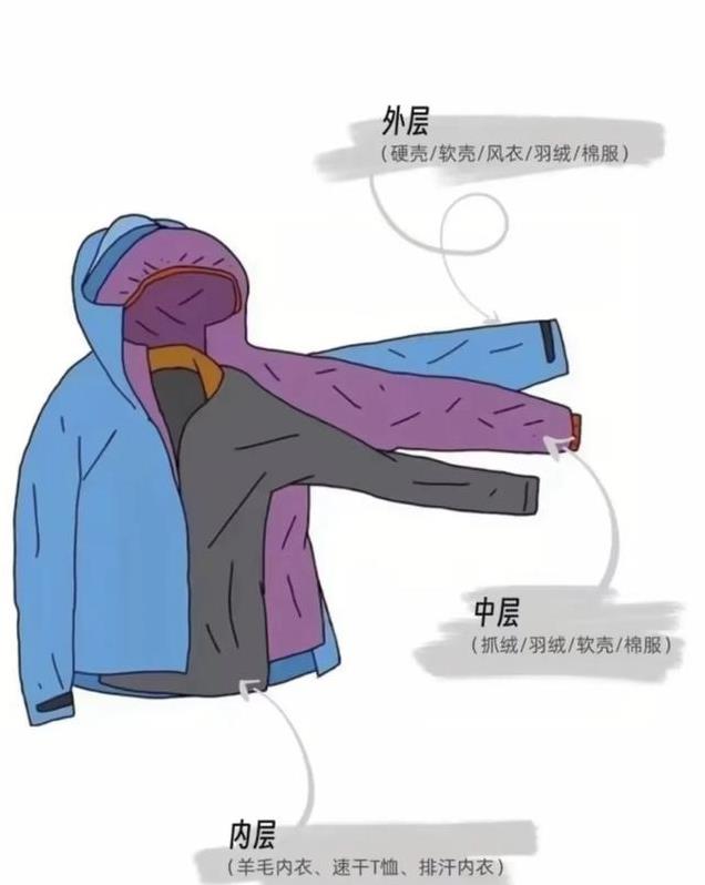 最贴身的是排汗层,选择速干面料,迅速将汗水导离皮肤;中间是保暖层,以轻盈且保暖的摇粒绒为代表,其蓬松的织物结构可以储存温暖空气;最外层则是防风防水层,用于抵御外界寒风。