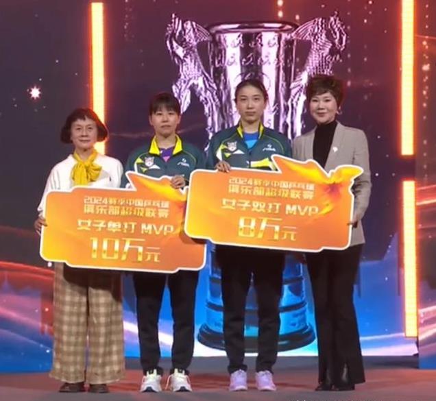 山东鲁能队的陈幸同获得今年乒超联赛女子单打MVP,获得10万元奖金。钱天一获得女子双打MVP,获得8万奖金。