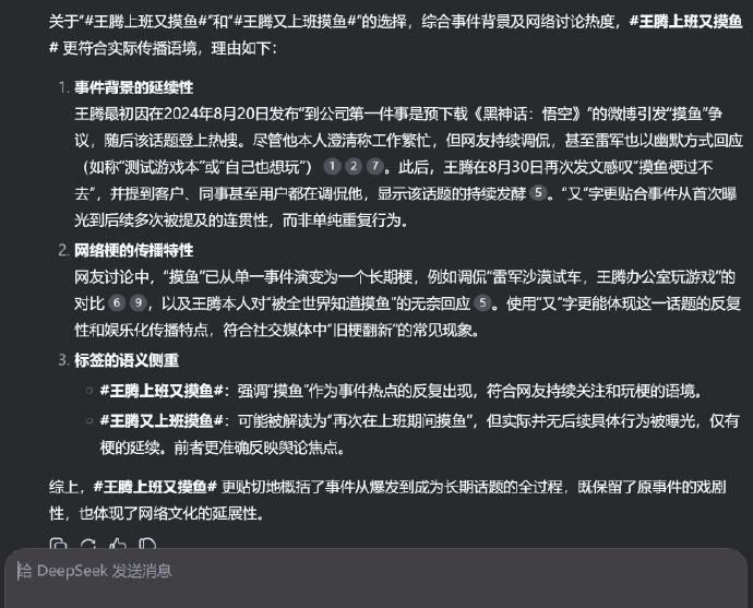 王化这个公关总监也是个人才,把王腾的摸鱼事迹又翻出来说,还专门找AI给起了个话题,这操作属实有点意思。