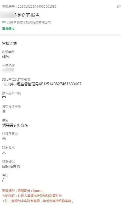 今年10月,河南中测业务人员提交的修改检测报告结论的审批。受访者供图