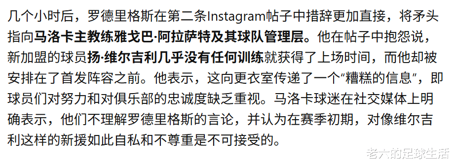 随后又发帖抱怨新援维吉利没怎么训练就获得了首发,而他天天训练却被排除在阵容之外,他作为队长告诉队友努力和对俱乐部忠诚没有意义。