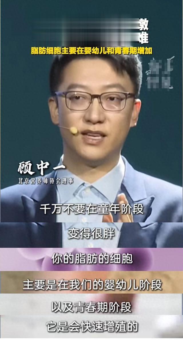 新华社发布了一个视频,里面是北京营养学会理事顾中一提到的:千万不要孩子在儿童期长胖,因为我们的脂肪细胞会在我们的婴幼儿阶段以及青春期阶段快速的增殖。