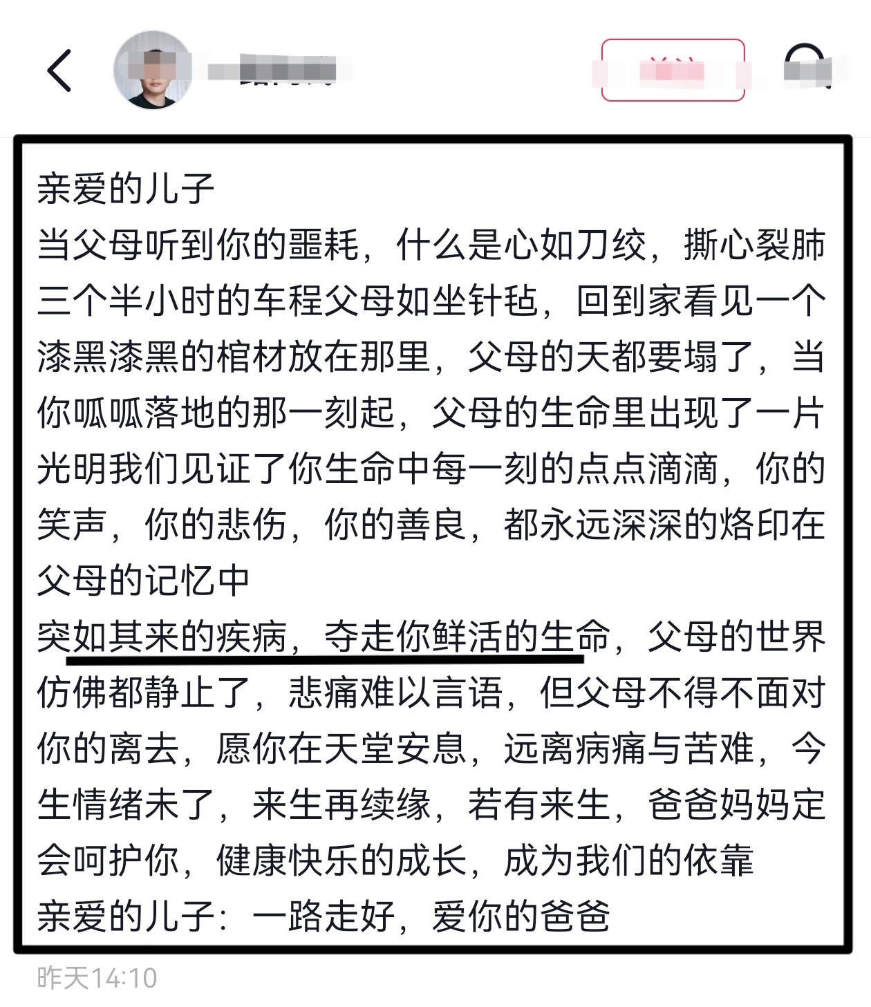 男孩的父亲也在社交媒体发文,听到儿子出事天都塌了,所有的美好都骤然消失,唯有期待来生再续前缘,呵护儿子健康成长。