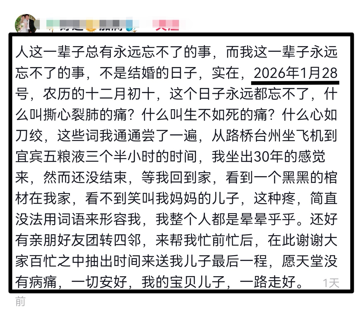 1月29日,四川宜宾一位母亲在网络上发文,痛别刚刚去世的儿子,并感谢前来送儿子最后一程的亲朋好友,言语之中让人惋惜。