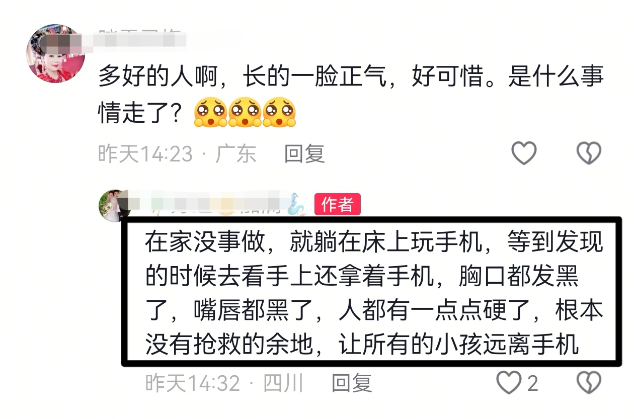 面对网友的惋惜之情,母亲表示儿子在老家没事做,整日就躺在床上玩手机,事发当日发现时,儿子手上还拿着手机,但胸口和嘴唇都发黑了,身体也有一点僵硬了,没有任何抢救的机会。