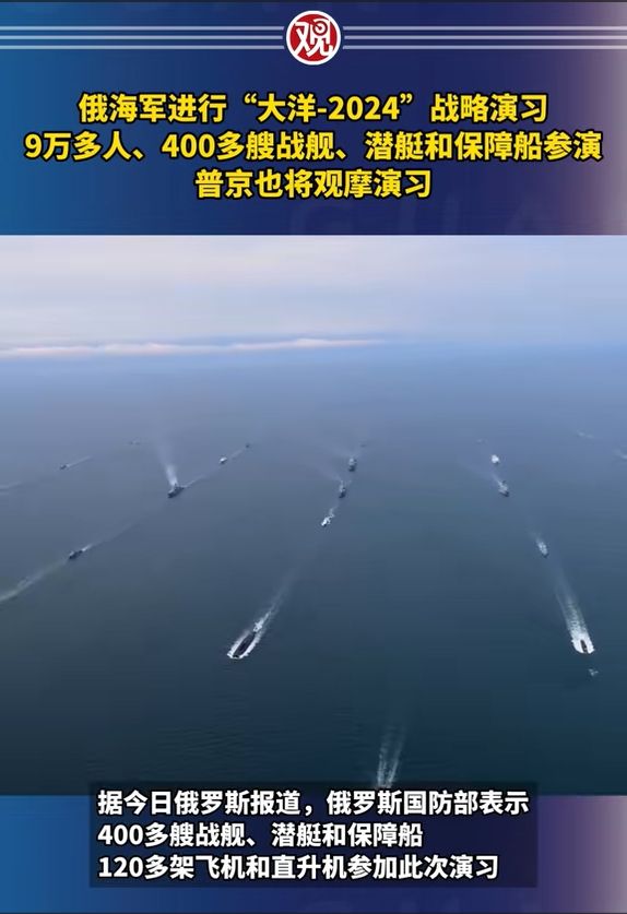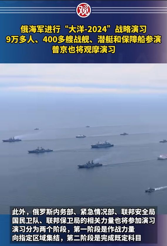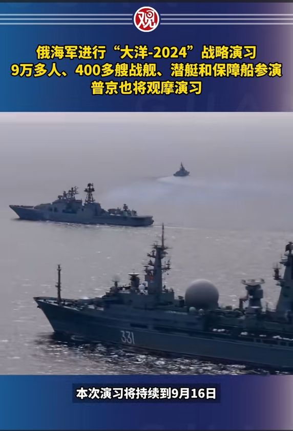 就在联合军演进行时,俄国防部宣布将举行“大洋-2024”大规模演习,计划动员超过9万名军人、400艘舰艇和120架战机,演习范围从地中海、波罗的海一直延伸到太平洋。如此广泛的演习规模,着实让人刮目相看。