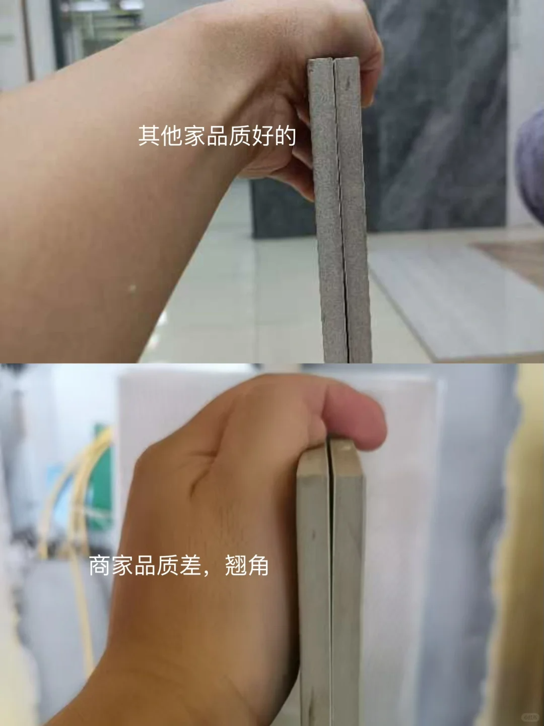 我们在选择瓷砖的时候,一定要避开平整度差的瓷砖。我们可以把两块瓷砖对着摆放,如果两片瓷砖中间有缝隙,那么这样的瓷砖我们就一定要避开。