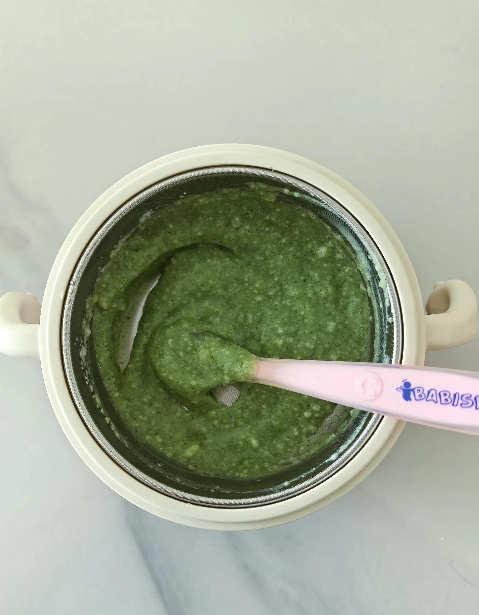 同时,我也添加了几种蔬菜泥,比如土豆泥、胡萝卜泥、菠菜泥、西兰花泥,以及一些水果如苹果、香蕉和梨。