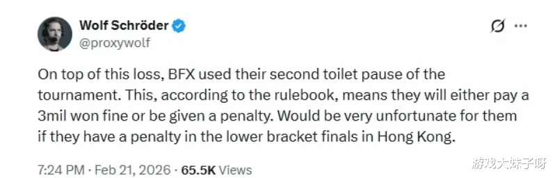 又一位LOL选手被处罚,比赛中暂停蹲坑,赛后被罚300万,LCK赛场从来不缺故事,但这一次的焦点,却不在操作与战术,而在“厕所”,在BFX对阵Gen.G的比赛中,BFX中途申请了暂停,而原因是选手需要上厕所,更戏剧性的是,这已经是他们第二次因类似原因申请暂停。按照联赛相关规定,战队因此被罚款300万韩元,折合人民币约1.4万元,比赛输了,钱也罚了,可谓“双重打击”。