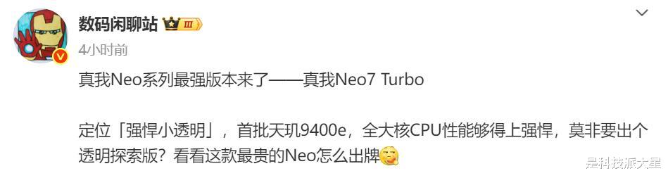 真我 Neo 7 Turbo 这次放出了大招,带来天玑9400e+7000mAh大电池+100W快充,外观上还有小升级,据说是透明探索版设计,基本可以预定中端机皇了。