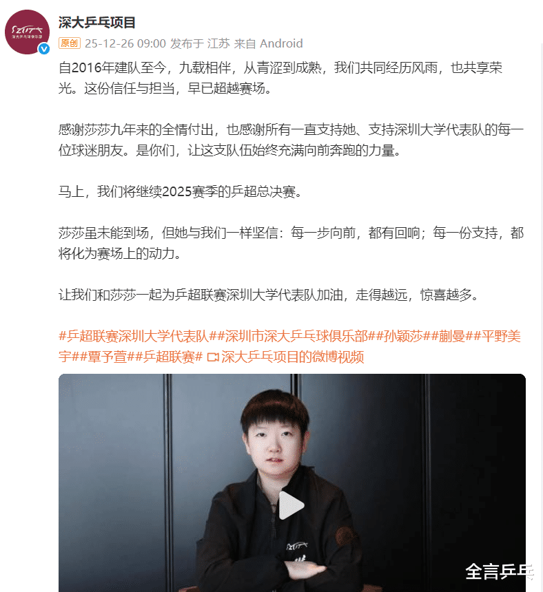 2025年12月26日,乒超总决赛首场半决赛——女团深圳大学VS上海龙腾开打在即,深圳大学队的头号主力、国乒奥运冠军主力孙颖莎正式确定不再出战,对此俱乐部也发文表示理解,球迷们也纷纷送上祝福,希望正在饱受伤病困扰的孙颖莎能早日康复。