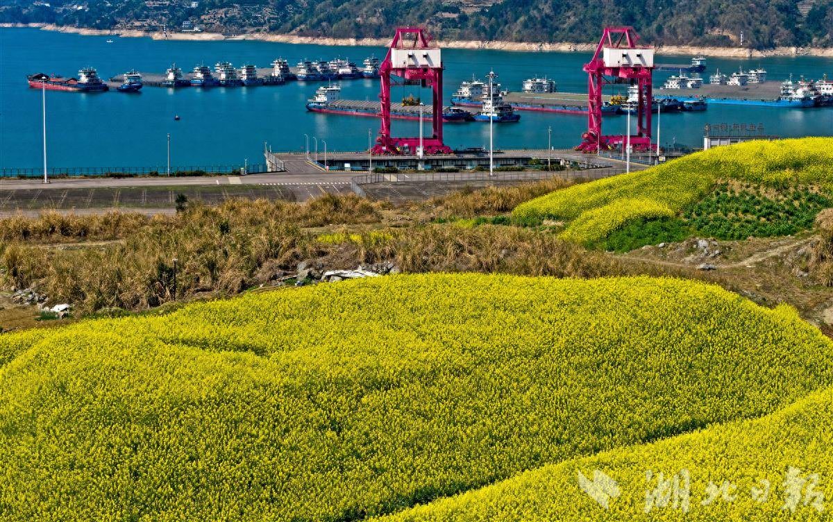 湖北秭归,长江岸边油菜花次第盛放,金色花海与码头红色岸桥、繁忙货轮相映成景。工业硬朗线条与田园柔美风光碰撞交融,春风拂过,花香与江风交织,绘就一幅春日峡江的绝美画卷。