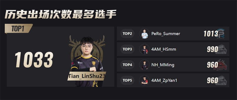 还有一项数据非常有趣,大家肯定想知道PCL联赛中“最老”的选手是谁,这里也有记录,天霸战队的林树选手出场次数达到了1033次,是目前联赛中出场次数最多的选手,其次就是PERO战队的SUMMER选手,如果阿伟不退役这个数据他应该是榜首,树哥也不愧是联赛的常青树。