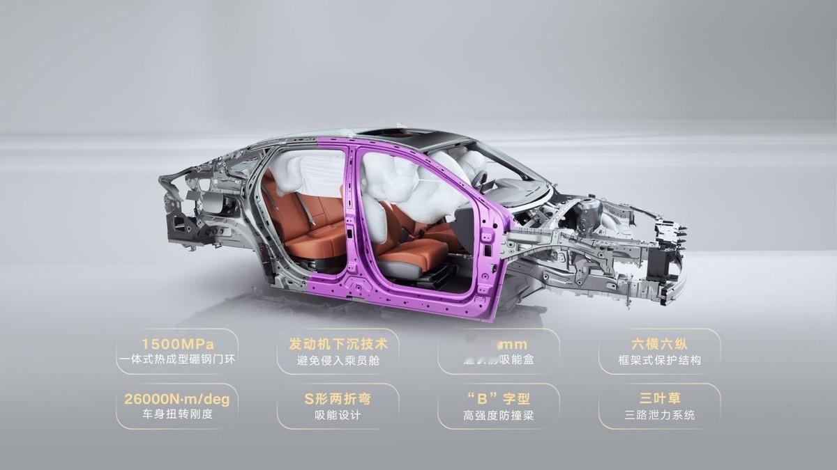 同时,它还配备了发动机下沉技术,碰撞时可带动发动机向斜后方下沉,避免其入侵乘员舱,进一步守护舱内人员安全。除了前舱的溃吸能设计,第五代帝豪的乘员舱也构建了坚固的防护体系。一体式热成型硼钢门环搭配六横六纵框架式底部结构,形成了稳定的笼式车身,其中一体式硼钢门环强度达1500MPa,能有效抵御各个方向的撞击。整车高强度钢占比达70%,钢材最高抗拉强度超1500Mpa,车身扭转刚度达到26000 Nm/deg,为乘员打造出铜墙铁壁般的生存空间。