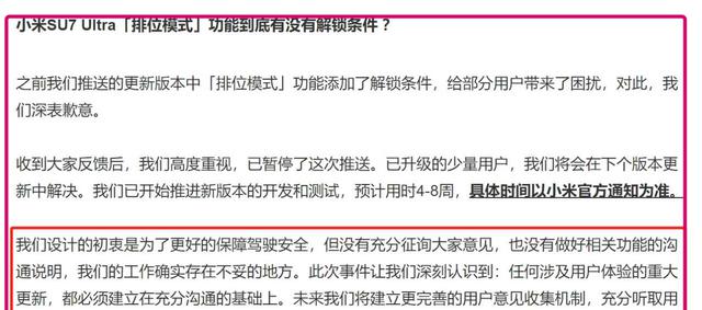关于排位模式,许多人好奇这一设计的初衷。排位模式的设定顾名思义,是为了通过关卡解锁车辆的全部马力,用户需要具备一定的驾驭能力才能充分体验到这款车的性能。虽然设计的初衷是出于安全考量,但这样的设定无疑也让一些有实力的驾驶者感到失望。一位常年在赛道上磨练的车主甚至毫不留情地评价:“小米这做法实在不妥,为什么要限制车主的体验?”这样的观点迅速在各大社交平台引发热议,许多驾驶爱好者表示,在赛道上没有人会因“解锁”马力而感到困扰,他们更希望能够直接体验驾驶的快感。通过这条反馈,我们不难看出,用户在追求产品性能时,对于设计的期许与现实之间存在着不小的差距。
