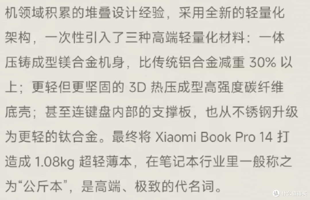 融合小米多年来在手机领域积累的堆叠设计经验,采用全新的轻量化架构,一次性引入了三种高端轻量化材料:一体压铸成型镁合金机身,比传统铝合金减重 30% 以上;更轻但更坚固的 3D 热压成型高强度碳纤维底壳;甚至连键盘内部的支撑板,也从不锈钢升级为更轻的钛合金。最终将小米笔记本 Pro 14 打造成 1.08kg 超轻薄本。