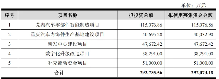 今年11月,宁波华翔计划向特定对象发行股票,拟募集资金总额不超过29.21亿元用于芜湖汽车零部件制造、重庆汽车内饰件生产基地建设、研发中心建设等项目。