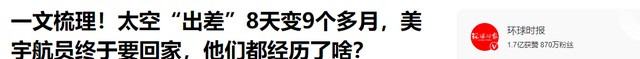 原文登载于环球时报3月18日发布的关于“一文梳理!太空“出差”8天变9个多月,美宇航员终于要回家,他们都经历了啥?”