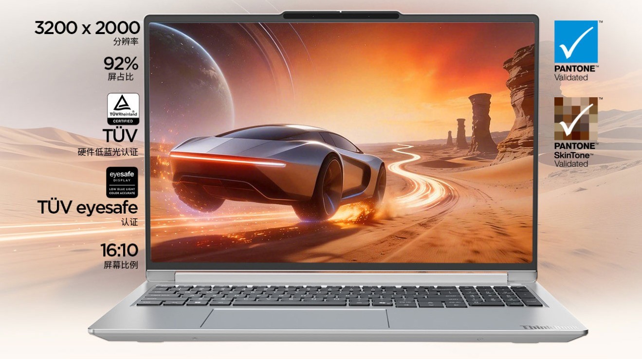 对于办公用户来说,大屏可以带来更好的视觉体验。一屏内显示的信息更多,避免了频繁滚动翻页的麻烦。ThinkBook 16+ 2026配备16英寸微边框全面屏,四边超窄边框设计使其屏占比高达92%,观看屏幕时有一种扑面而来的沉浸感。同时其屏幕采用了3.2K超高清分辨率(3200×2000),支持165Hz刷新率,通过了莱茵硬件级低蓝光认证和eyesafe护眼认证,并且通过了Pantone色彩认证,长时间用眼损害降低的同时,确保了精准的色彩表现。