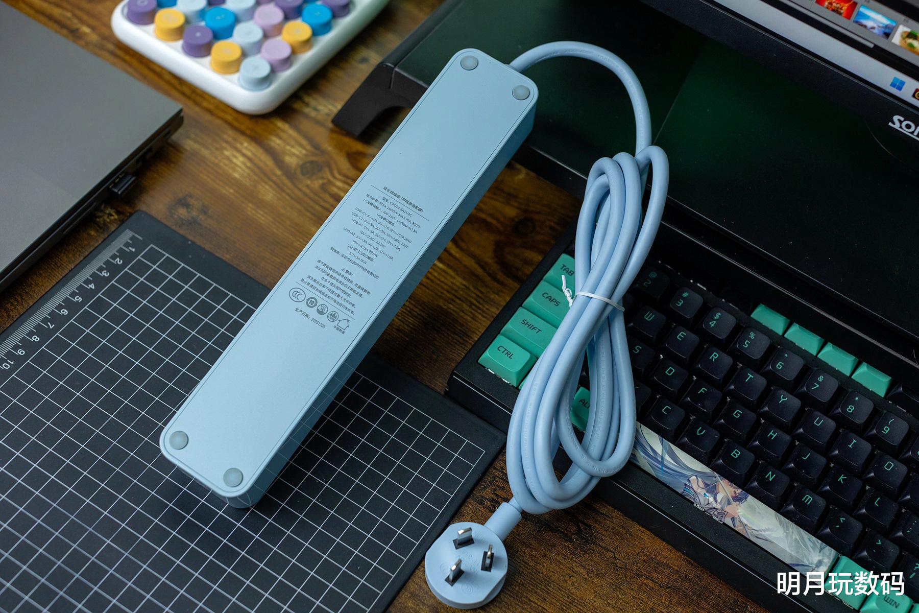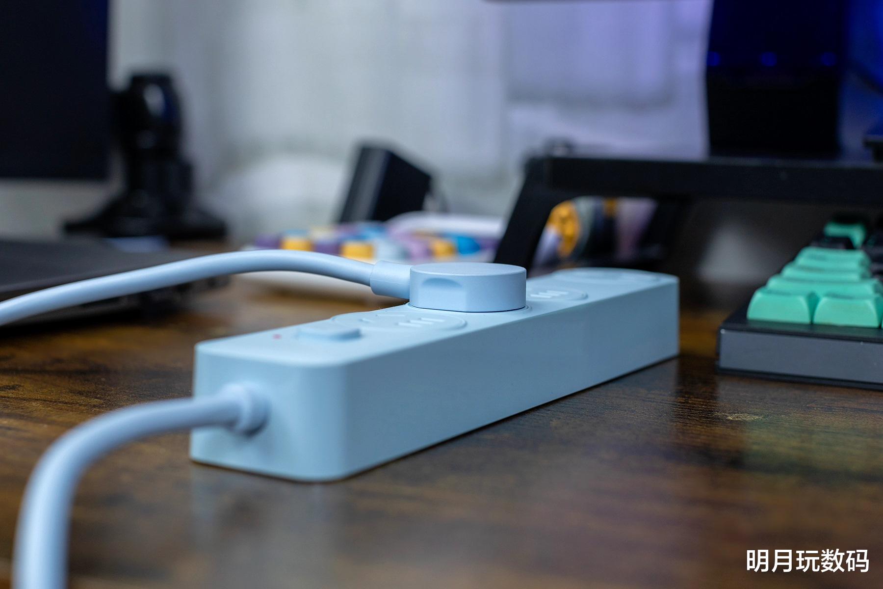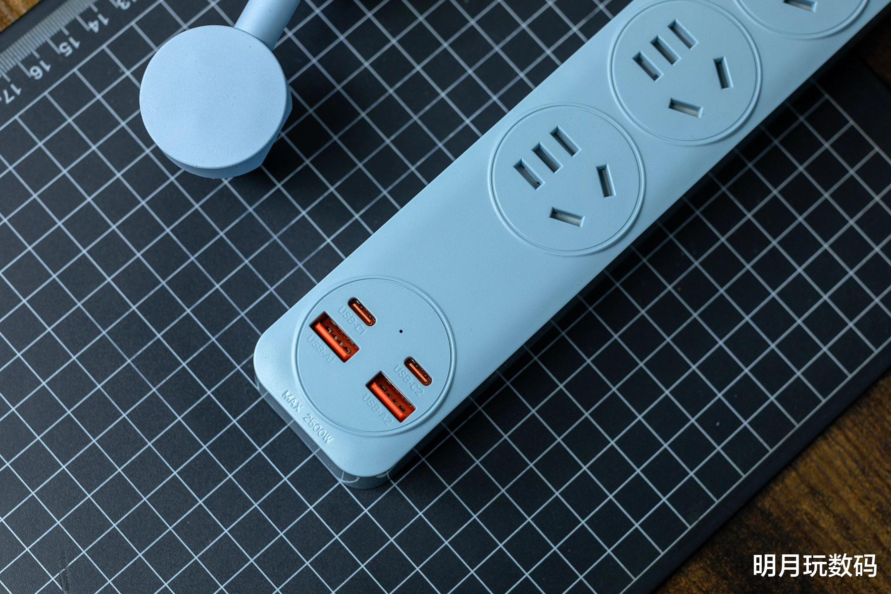 在实际使用方面,插排的3个AC接口都采用了新国标组合孔设计,插座上的儿童安全门需要75N以上力度才能开启,可有效防止儿童误触现象。而且两个插孔间的间距适中,不会有以往出现的插头“打架”现象。另外,在办公室场景使用时,该排插可放置在桌面边缘,不会占用过多空间。同时为笔记本电脑、显示器、台灯、手机和智能设备等同时供电,也不会影响到桌面整洁。