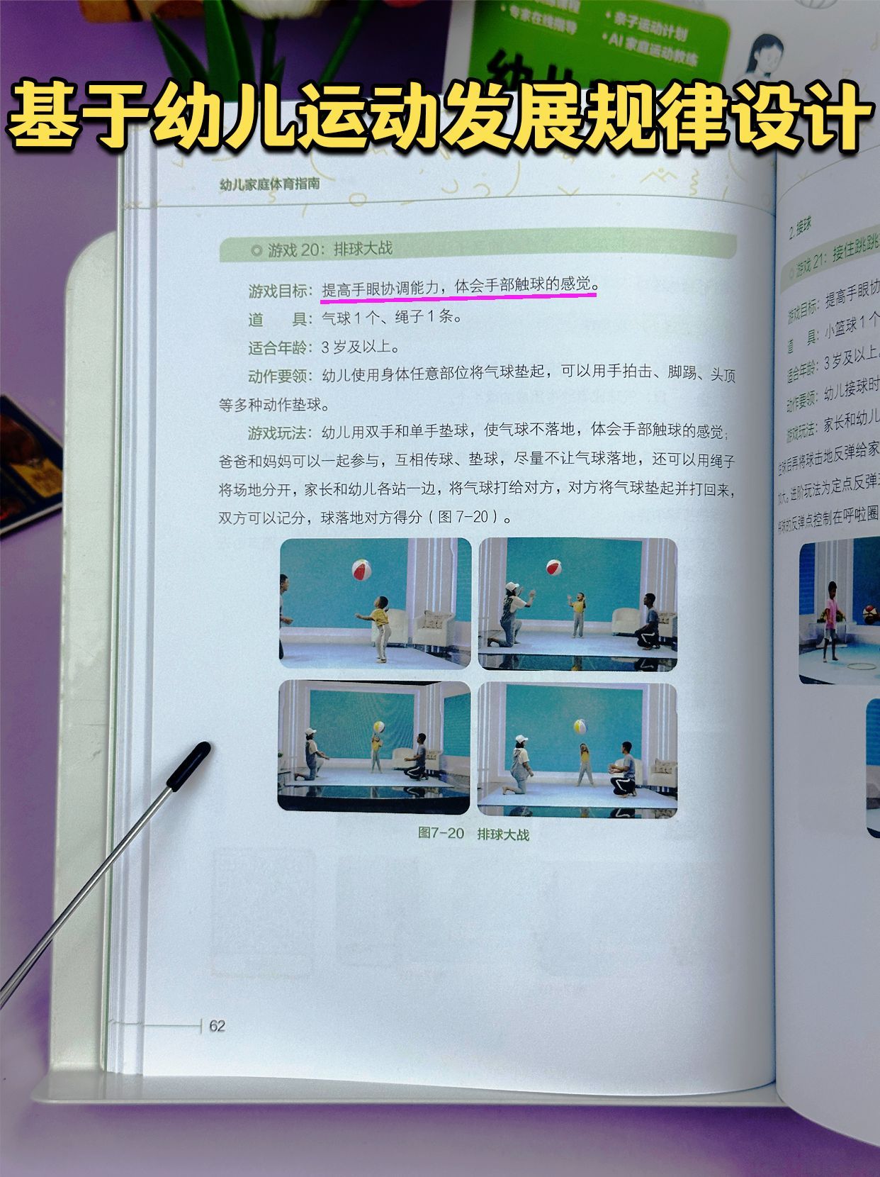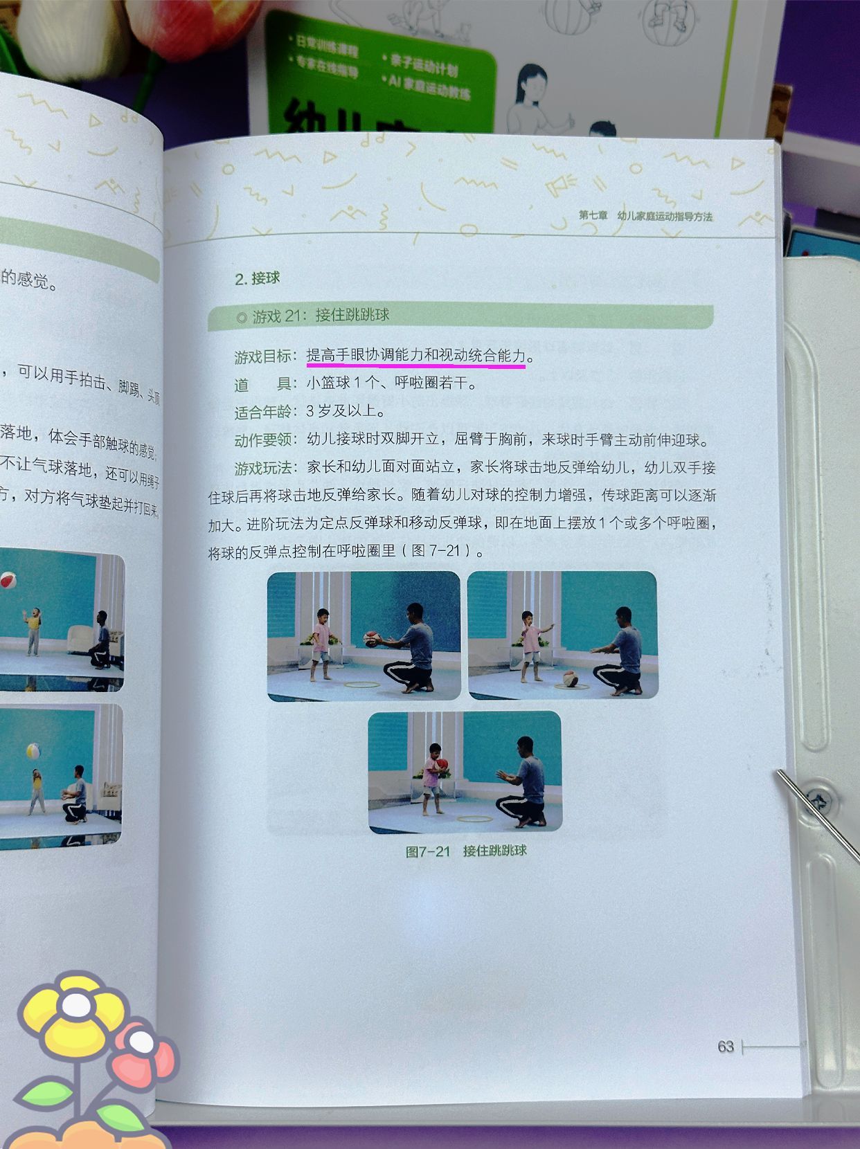 动作要领:幼儿向上抛球;抛球高度从低到高循序渐进,熟练后可以尝试拍手后再接球的进阶玩法。与家长互抛球时,幼儿要有伸手接球的准备动作和伸手迎球的接球动作。