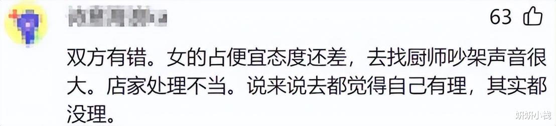 这位网友称,两边都不干净。那女的想占便宜还嘴臭,跑去厨房嚷嚷;店家也不会办事,硬把小事闹大。都觉得自己占理,其实半斤八两。