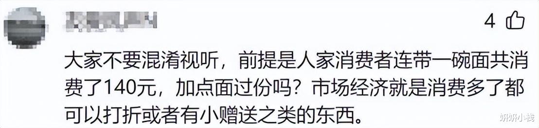 另一位网友的看法是,别被带跑偏了。人家一共花了140块,可不止一碗面。多点几根面怎么了?买卖讲究你情我愿,消费多了给点添头,天经地义。