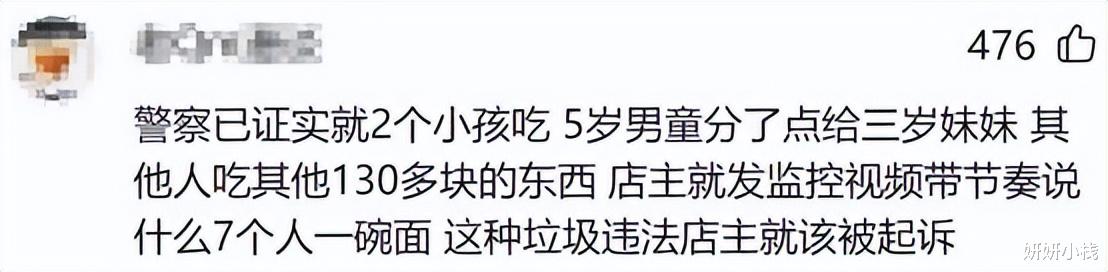 有网友表示,警察已经说了,就两个小孩吃了那碗面:5岁的哥哥分了点儿给3岁的妹妹,剩下那130多块的菜都是大人点的。店老板却剪了段监控出来带节奏,嚷嚷“七个人吃一碗面”,这种造谣就该告他。