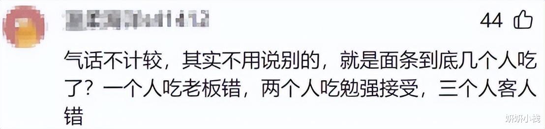 还有网友认为,咱不翻旧账,就问一句:那碗面到底几个人吃?一个人吃,老板怂;俩人吃,还能理解;要是三个人都动筷子,那就别怪店家。