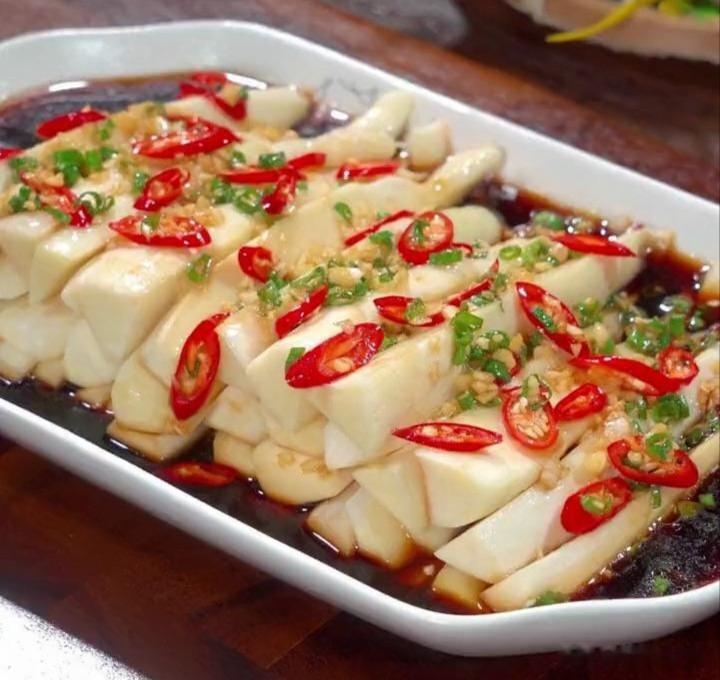 4、把蒸好的茭白取出来,撒上葱花、蒜末、小米辣圈;另起一锅,烧1勺热油,趁热泼在调料上,“滋啦”一声激出香味,再淋上煮沸的料汁,就可以端桌了,脆嫩鲜甜,清香味儿足。