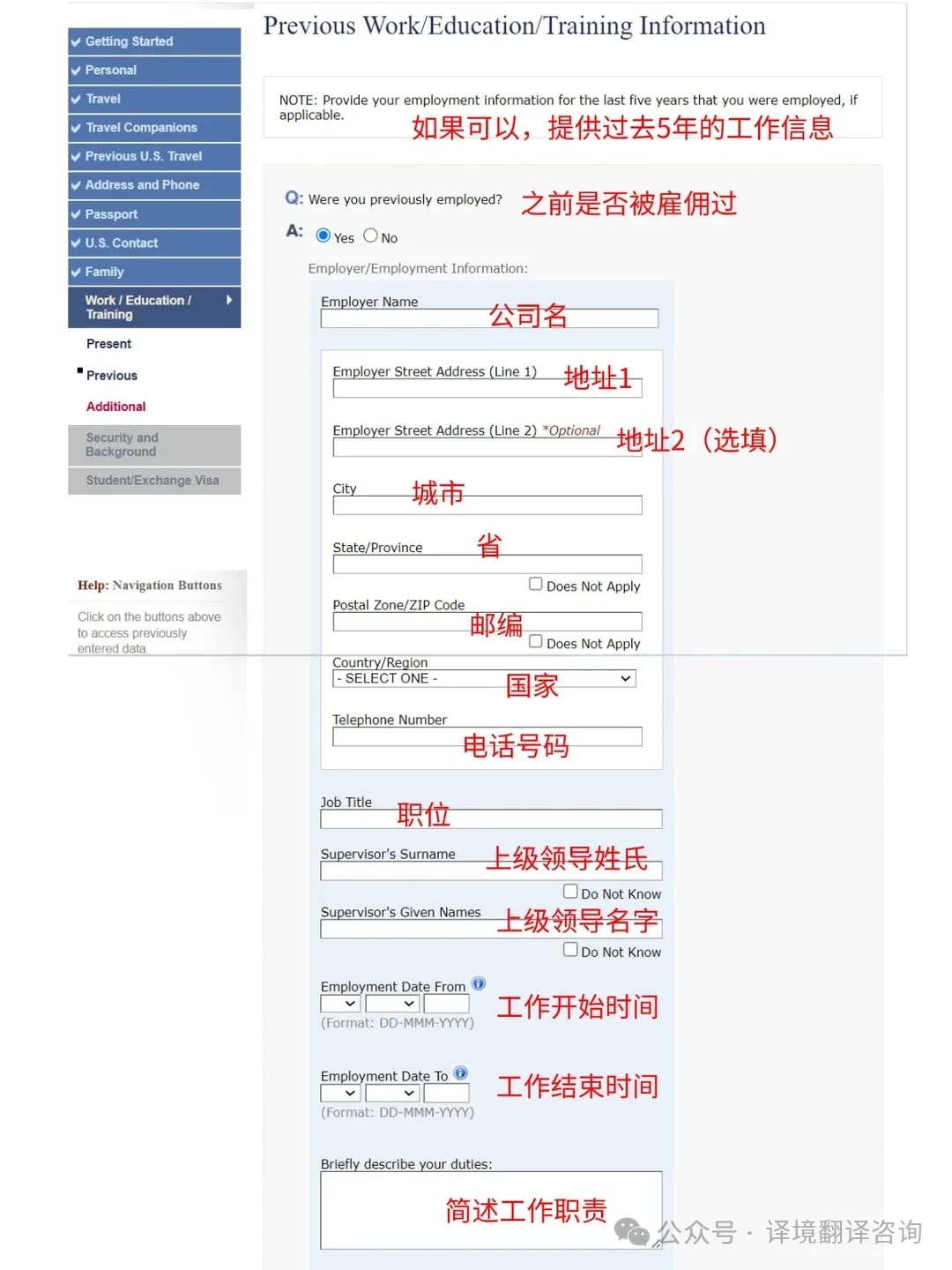◆ 重新填写表格时,务必与护照、在职证明等其他材料信息一致(如工作单位名称、地址,需与在职证明完全一致),避免出现新的矛盾。