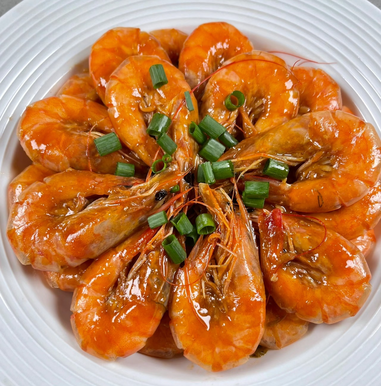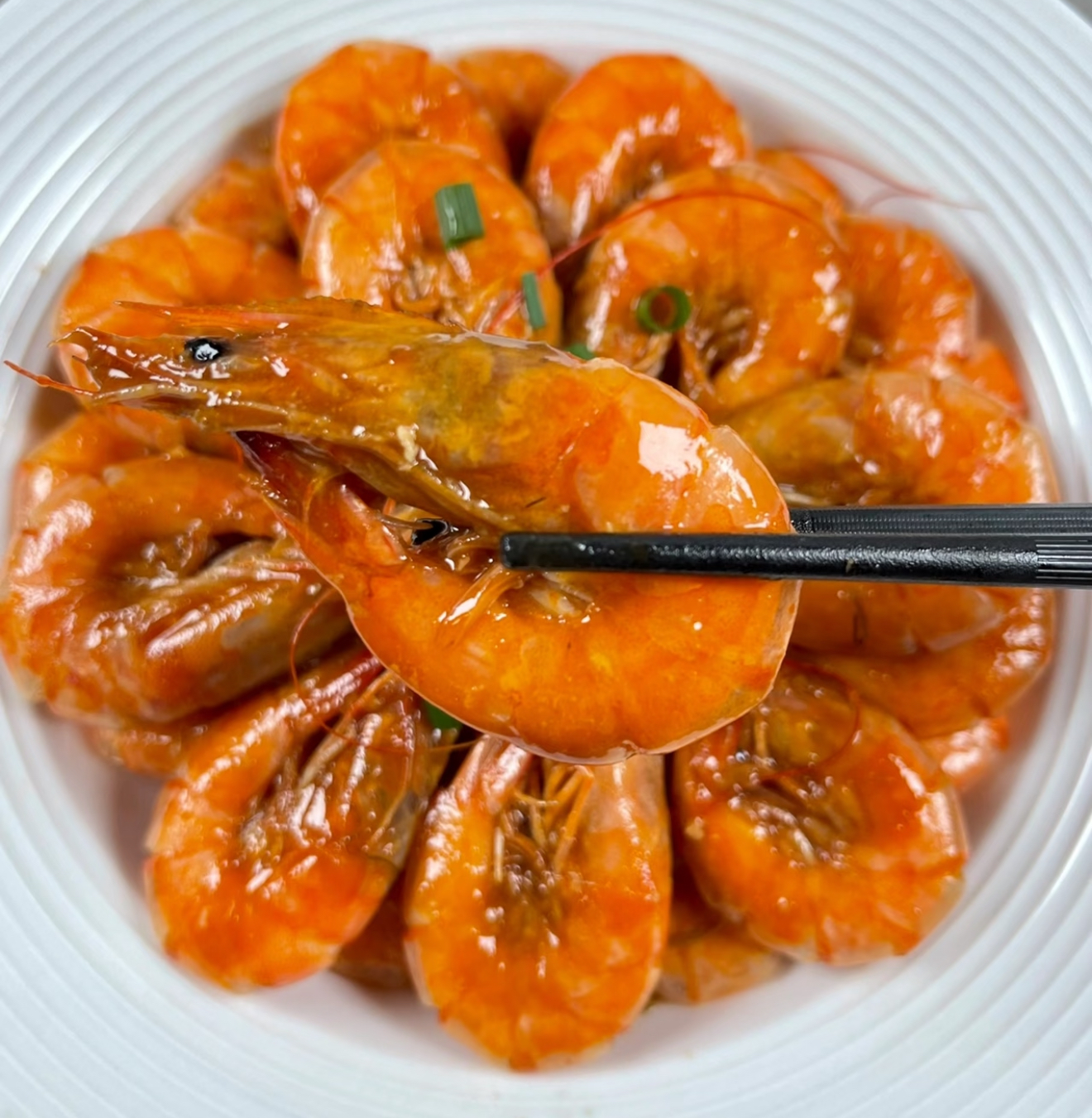 把虾倒回锅中,让每只都裹满酱汁。这时要像照顾初恋般温柔——盖上锅盖焖2分钟,让虾肉吸饱汤汁。开盖后转大火,看着酱汁从大泡变小泡,变得浓稠能挂在铲子上时,立刻关火!余温会让酱汁继续收紧,这时候撒把翠绿的葱花,红绿相间煞是好看。