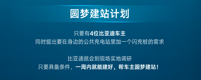 第二件:开启“圆梦建站”计划。只要有4位比亚迪车主同时提出申请,在具备条件的地方,比亚迪就去给你建站。