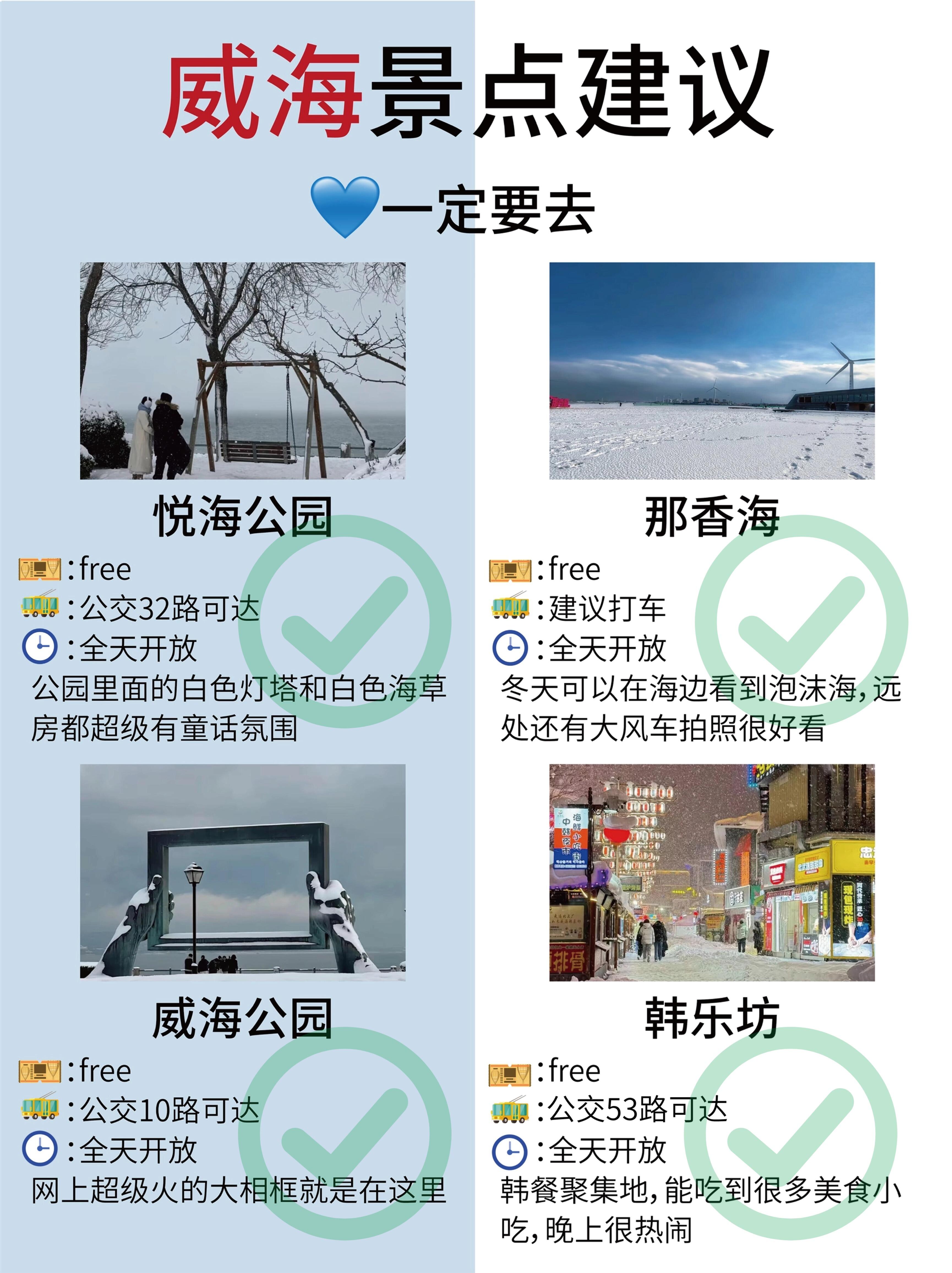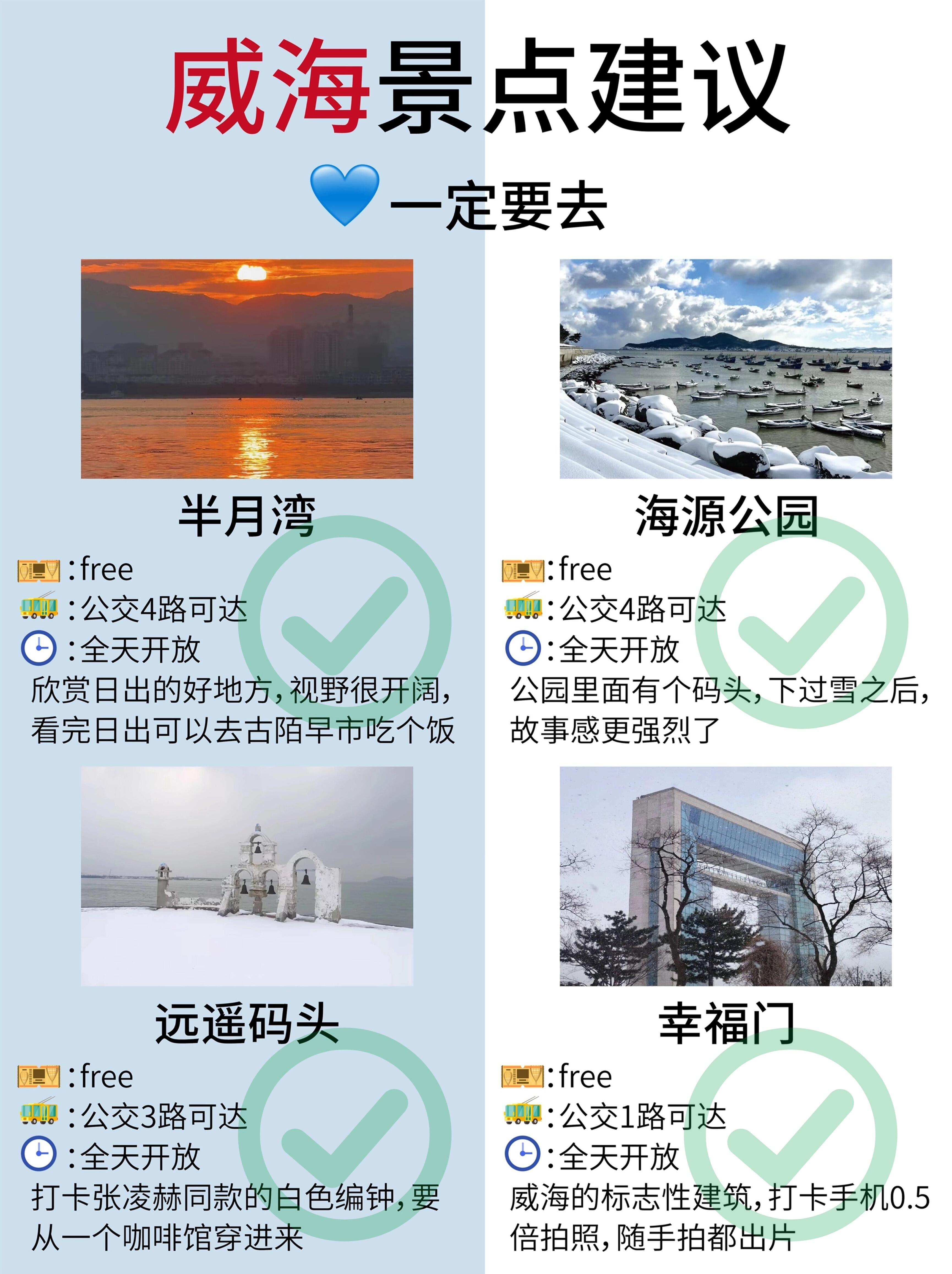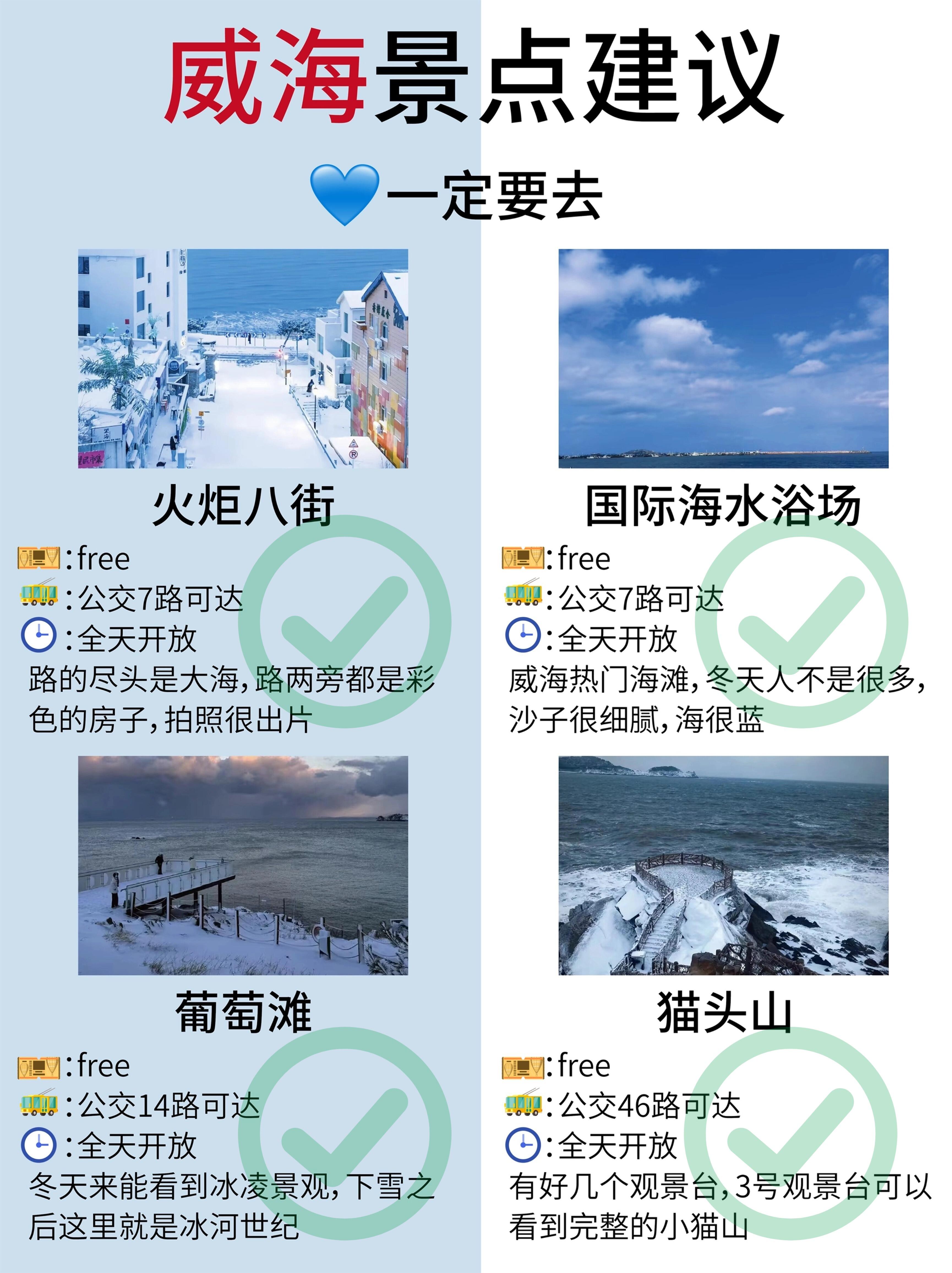 ✅市区早上可以先去火炬八街,趁着人少,拍照效果好,接着沿线游玩一下葡萄滩🍇和远遥码头,再去小猫山😺看看,下午去威海公园和悦海公园⛲️转转