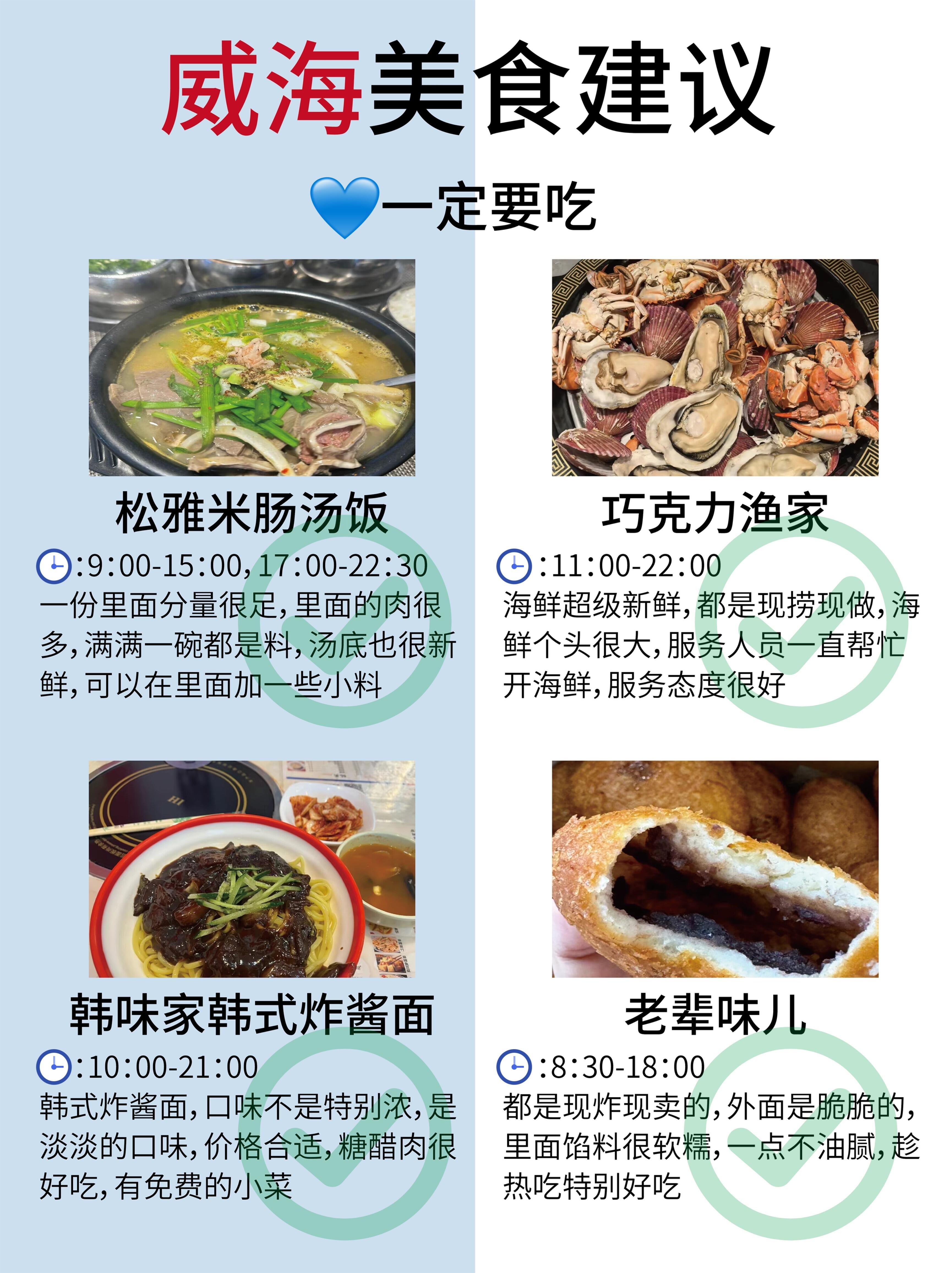 来威海一定要吃海鲜和韩餐,海鲜可以去巧克力渔家🍫,味道很鲜美,🦐海鲜种类也很多,💰价格还很实惠,我经常会去吃,韩餐可以去韩乐坊,那里有很多很正宗的韩餐🍝,各种各样的都有,好多老板都是韩国人