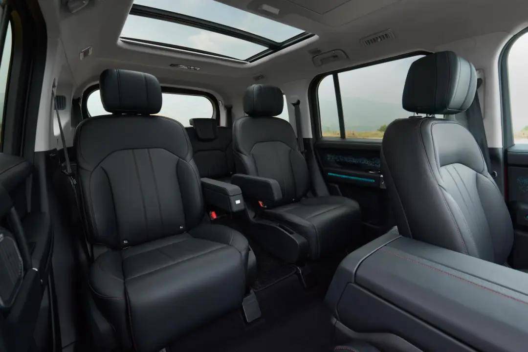 而且,纵横G700在5座版本之外,还提供了2+2+2的6座座椅布局,其第二排配备独立航空座椅,具备腰部调节、腿托调节,8点按摩/通风等配置,相较于坦克500 HI4-Z的第二排来说更显尊贵。