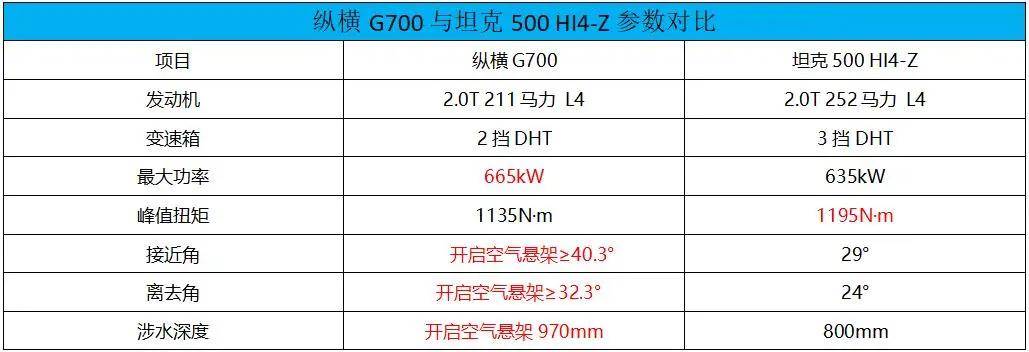 在这其中,坦克500 HI4-Z与后来者纵横G700显然是佼佼者,消费者想要购买一台国产高端方盒子时,这两台车是绕不过去的选择。二者究竟谁更称得上国民全领域出行之王,本文将选择纵横G700乾崑版(顶配)与坦克500 HI4-Z智享版(顶配)进行对比,从越野能力、驾乘体验、配置多寡、智驾表现等层面来论述,看看谁更能满足消费者全场景下的用车需求。
