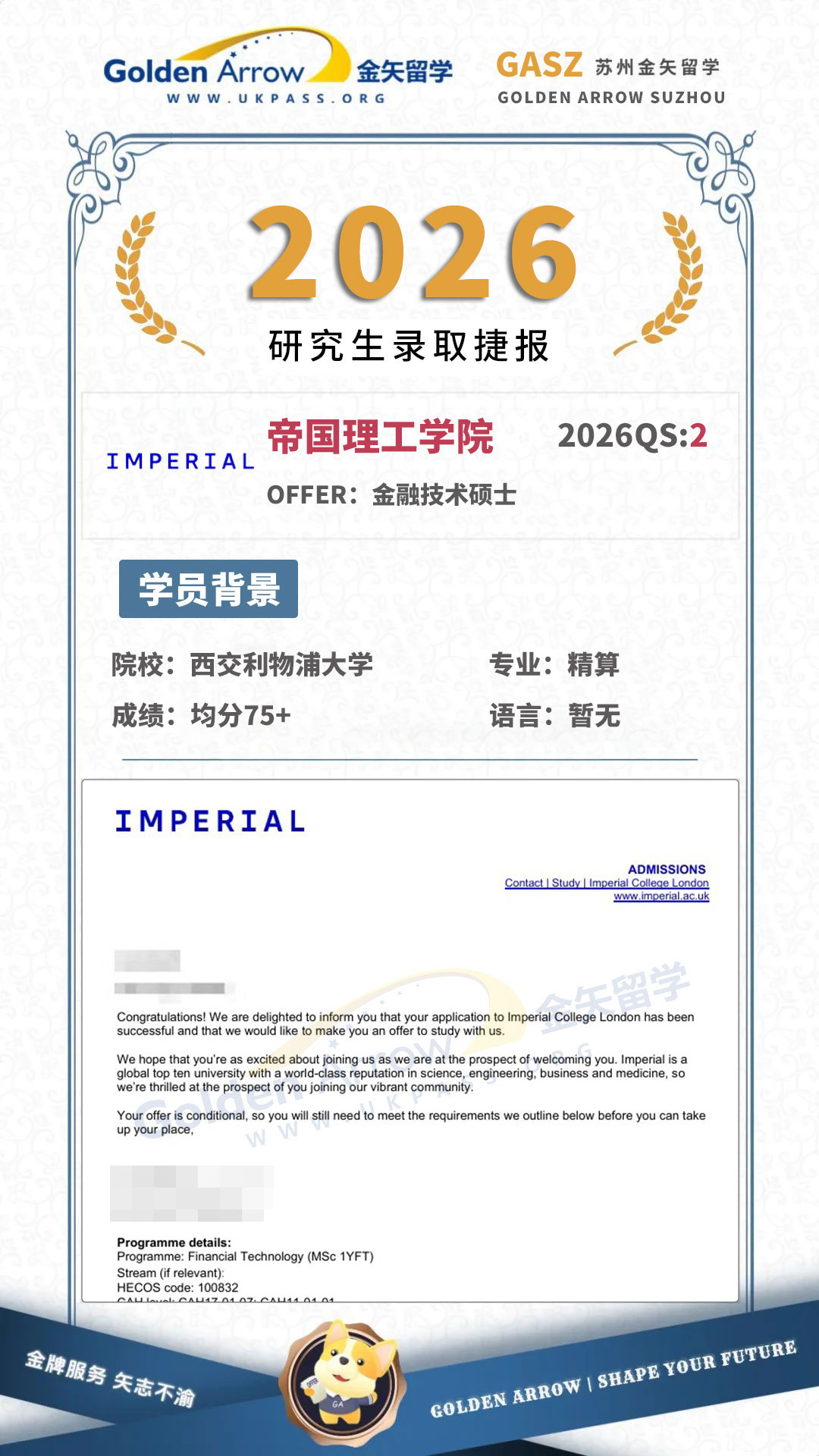 英国名校申请案例:西交利物浦大学精算专业的学生,以均分75+及暂无雅思的背景,通过金矢留学成功申请到了QS世界大学排名第2位的英国帝国理工学院金融技术硕士,下面一起来看下!