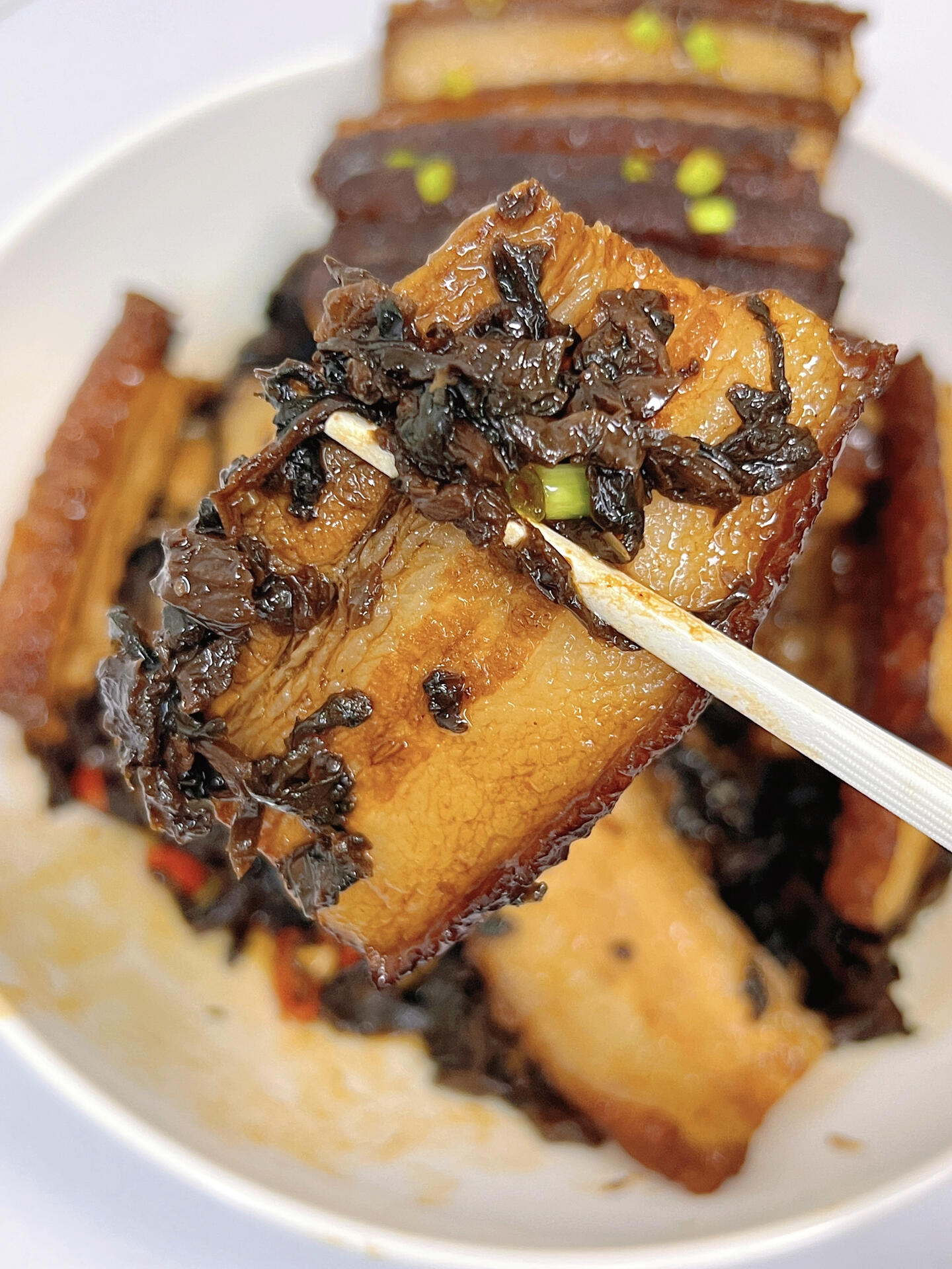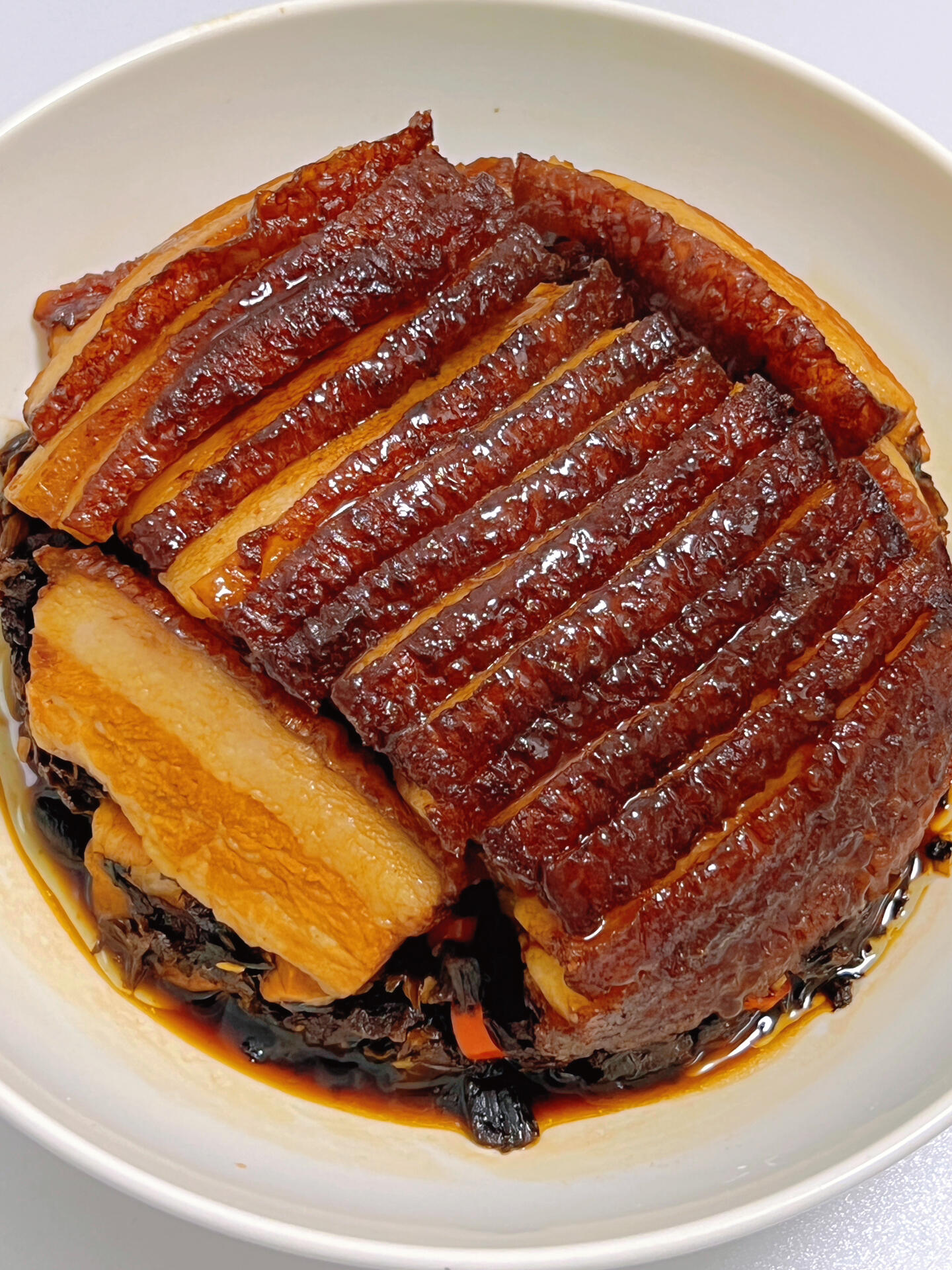 把做好的梅菜扣肉端上桌,那金黄的五花肉上铺满了黑亮的梅干菜,看起来就特别诱人。夹起一块五花肉放进嘴里,肥而不腻,梅干菜的咸香和五花肉的鲜美完美融合,简直是绝配!这道梅菜扣肉,不仅简单易做,而且超级下饭。