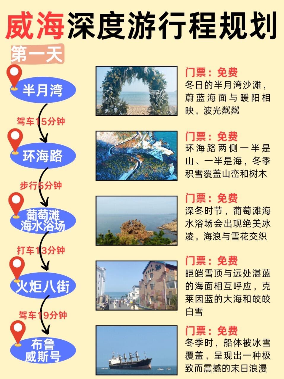 - 威海国际海水浴场:雪后沙滩像撒了糖霜,踩上去咯吱响,远处海鸥盘旋,日落时橘色霞光映着白雪蓝海,美到失语🌅