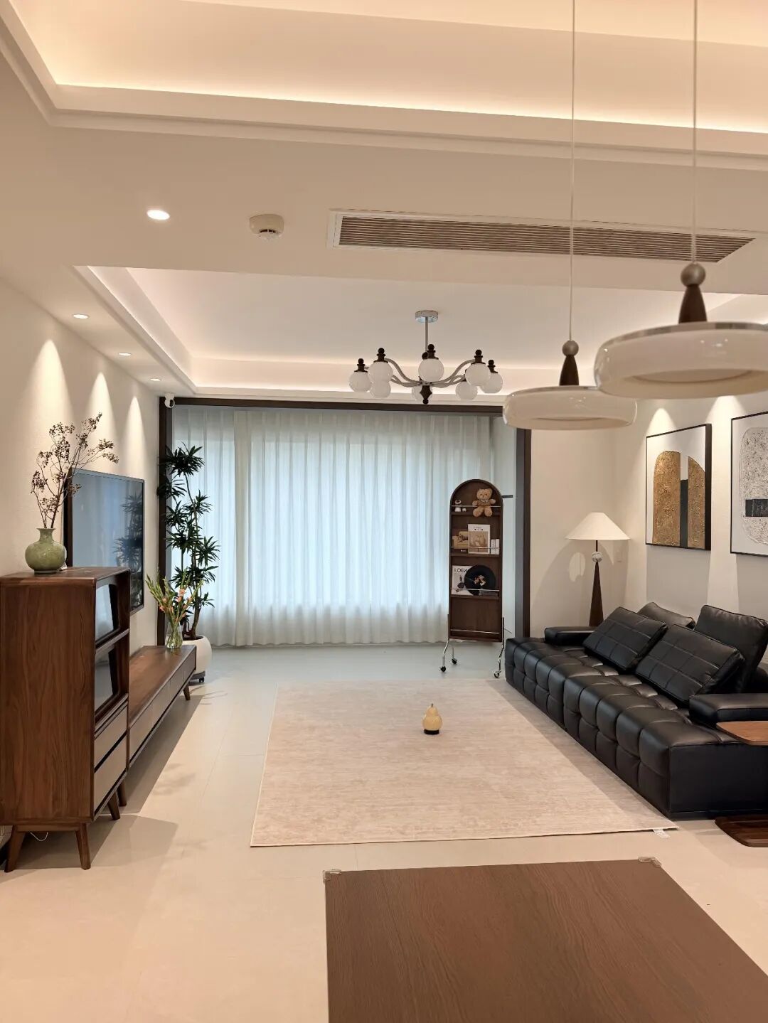 深色软装是点睛之笔,比如胡桃木家具、深色窗帘、深色抱枕,既能中和浅色的单调,又能提升整个家的质感,让空间更有层次感。