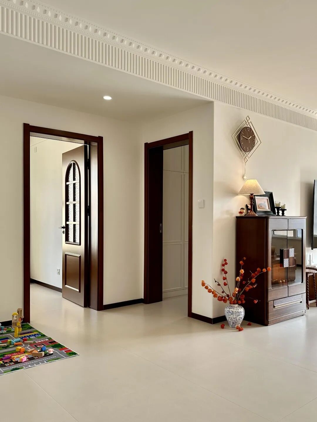 而用两圈石膏线,没花几个钱,屋子却精致,不浮夸,简单又耐看,还保留了原本的层高。
