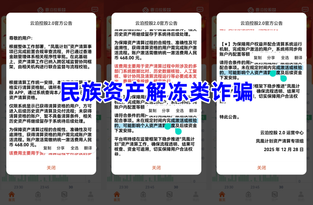 民族资产解冻类诈骗。网友反馈,一个名为“云泊”的诈骗项目,近期又开始活跃,声称缴纳468元激活该项目,此前所有的投资款,都可以进行提现。