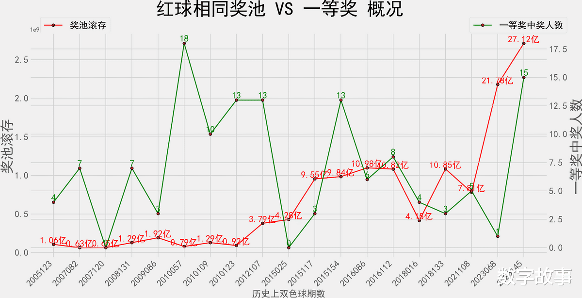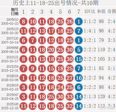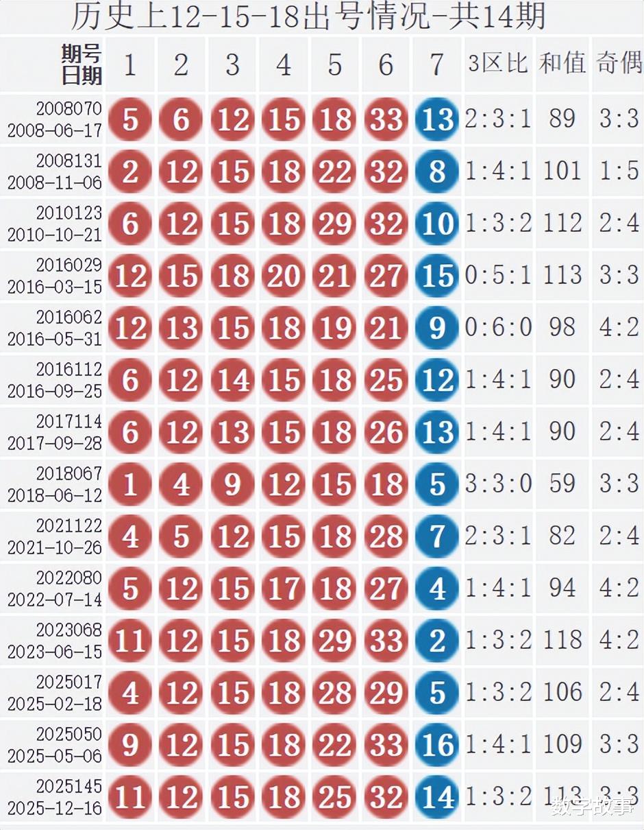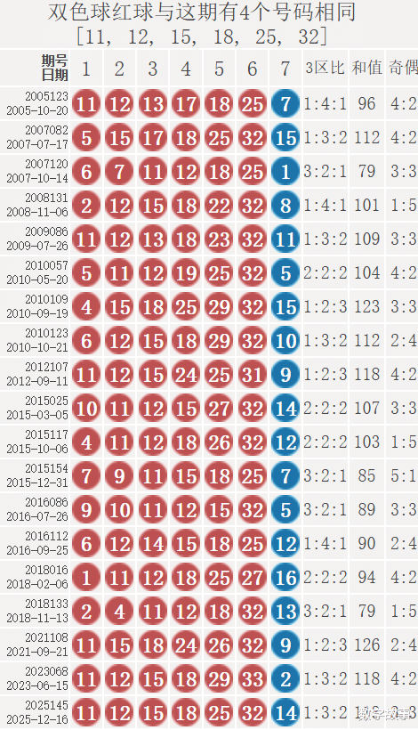 双色球2025145期红号在过去是否出现过?双色球2025145期红号: 11-12-15-18-25-32经查,历史上没有出现过与这一期6个红球或者5个红球号码一样的。与这一期4个红号一样的有18期,如下: